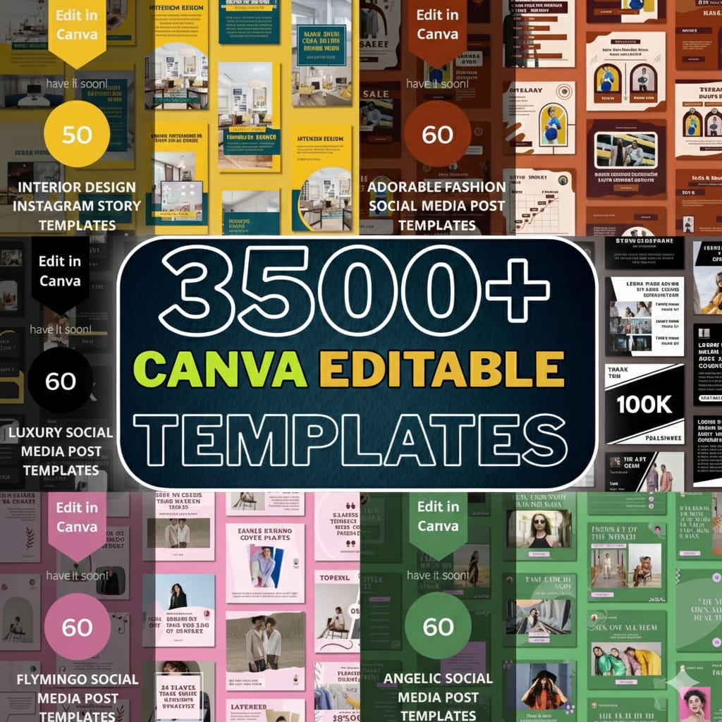 A massive bundle featuring over 3500 fully editable social media templates designed for Canva, suitable for all types of businesses and digital projects. This diverse collection includes a wide range of professional designs perfect for Instagram posts, Facebook, Pinterest, and social media stories, with easy customization of colors, fonts, and images.